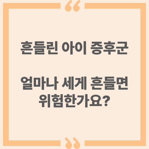 얼마나 세게 흔들면 생기나? 에 대한 안전선은 없습니다. "절대 안전한 흔들기"란 존재하지 않습니다. 흔들린 아이 증후군은 격렬한 흔들기나 충격으로 발생하며, 정상적인 놀이 및 일상적 이동으로는 생기지 않습니다.