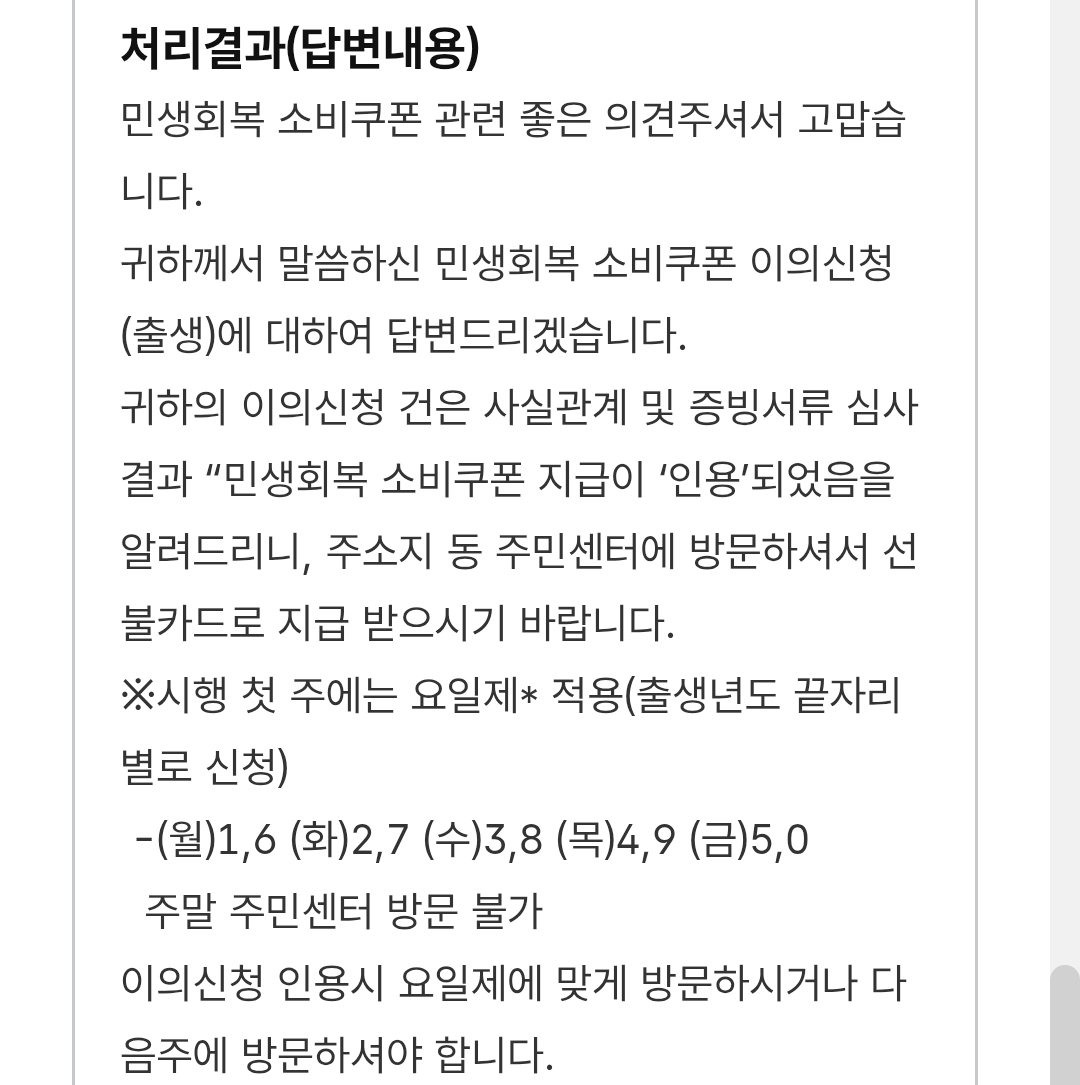 - 이의신청 접수 후 심사가 완료되면 민생지원 소비쿠폰은 읍면동 주민센터에서 선불카드로 지급 받을 수 있습니다.
